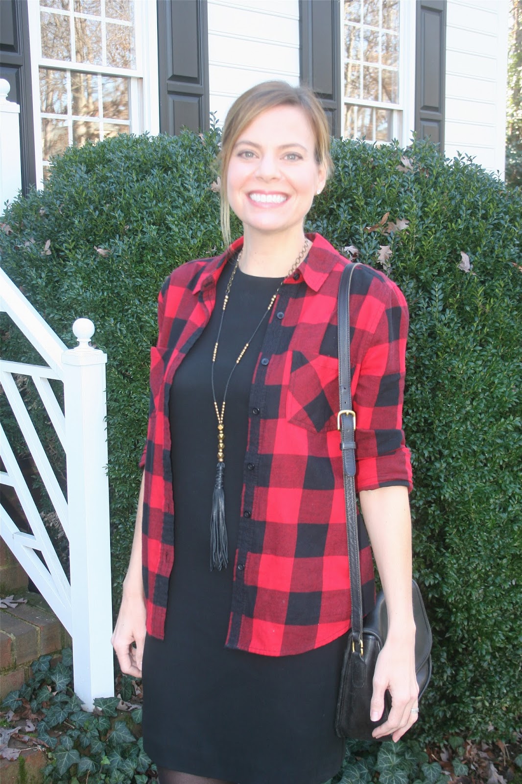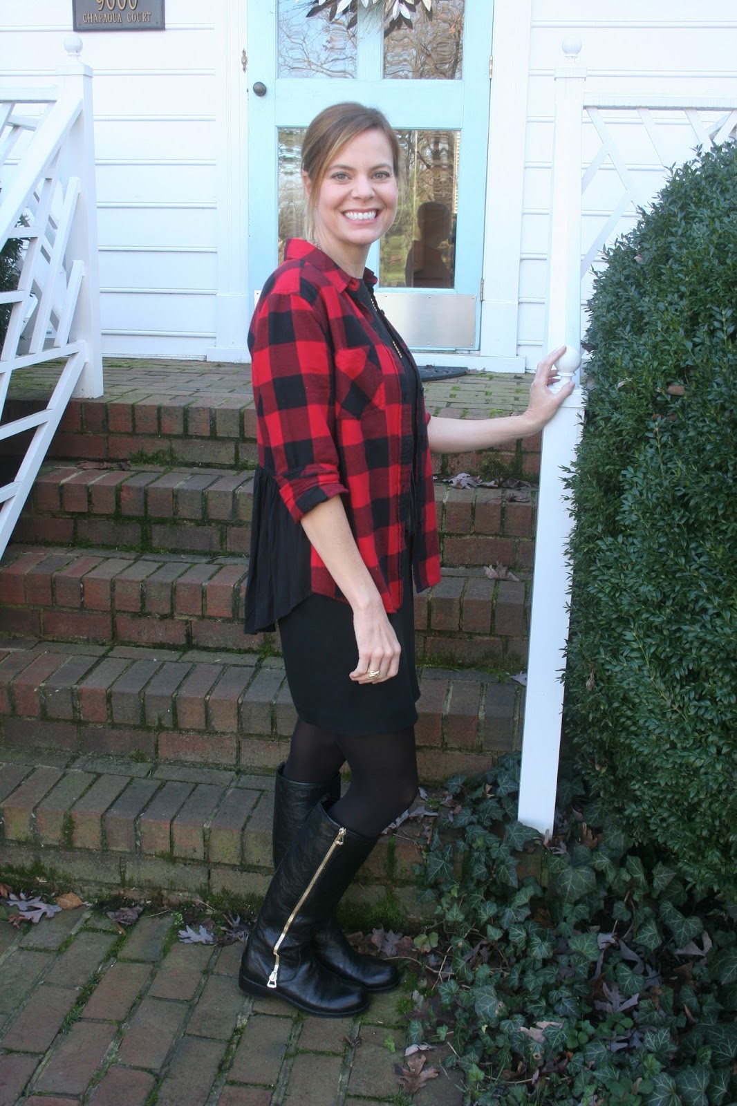 Wait a minute…is that buffalo plaid with an LBD? Yes, ma’am. I LOVE this look! The tough boots and leather fringe necklace make a real statement, and the sweet ruffle on the back of the shirt puts a girly vibe back into it. Of course, the ruffle isn’t necessary–just a fun detail.